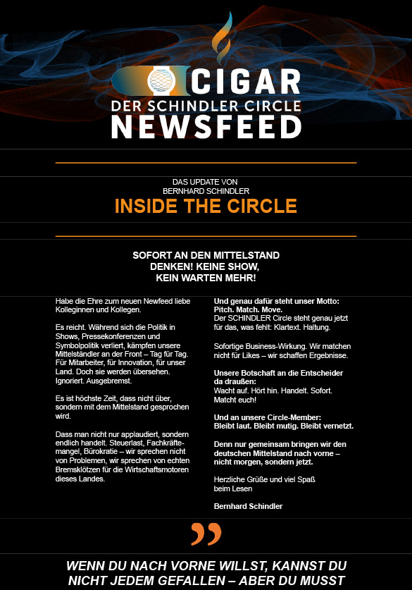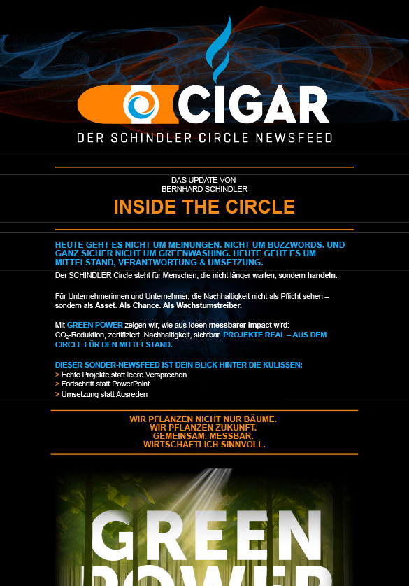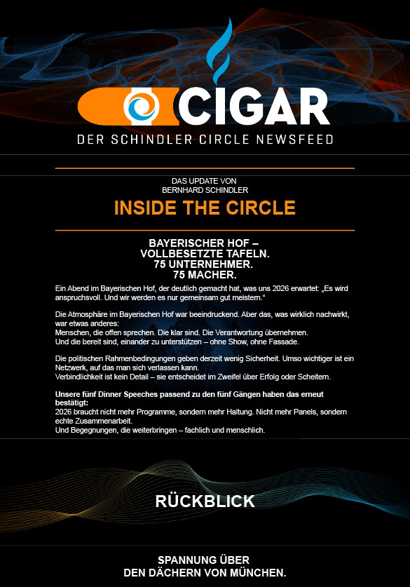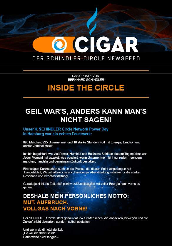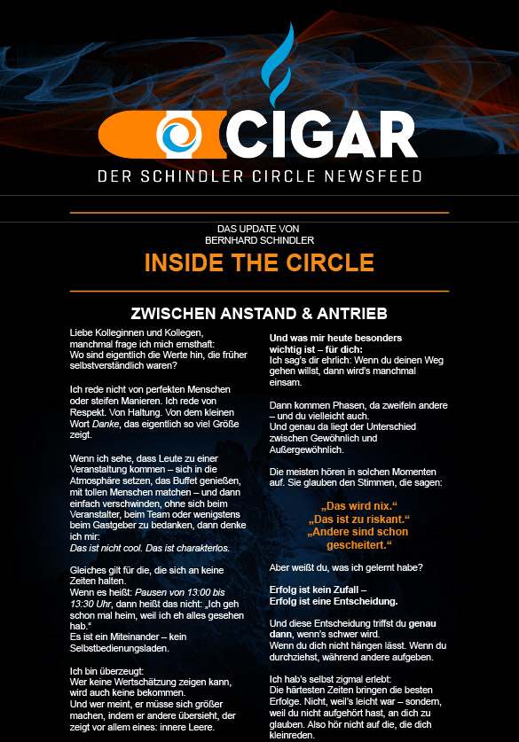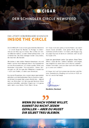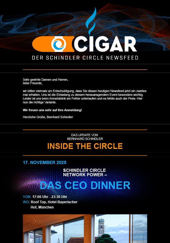 Melde dich bei unserem Cigars Newsletter an und erhalte exklusive Einblicke in Termine, Erfolgsstories und weitere spannde Nies und Insights rund um den SCHINDLER Circle